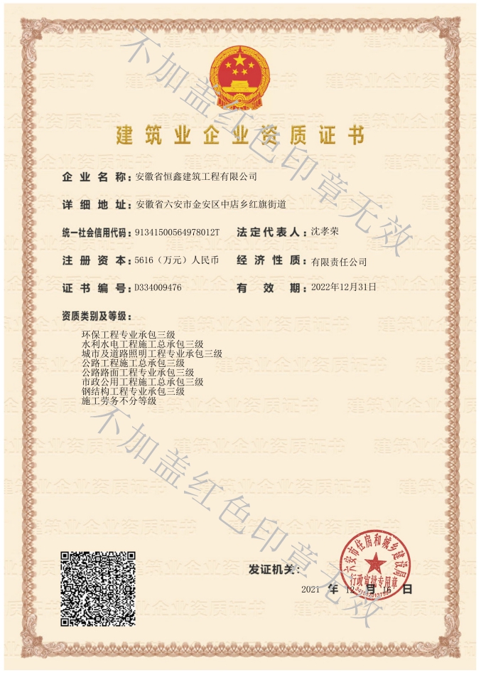 安徽省恒鑫建筑工程有限公司成立于2010年11月,是一家以房屋建筑、市政工程,水利水電、公路橋梁、建筑智能化等施工為一體的民營企業(yè),經(jīng)過多年的發(fā)展,企業(yè)注冊資本5616萬元人民幣,現(xiàn)有員工150余人,獲得本科以上學(xué)歷的人員近20%,大專以上的人員超過50%;二級(jí)以上注冊建造師18人,中級(jí)以上職稱人員100余人。